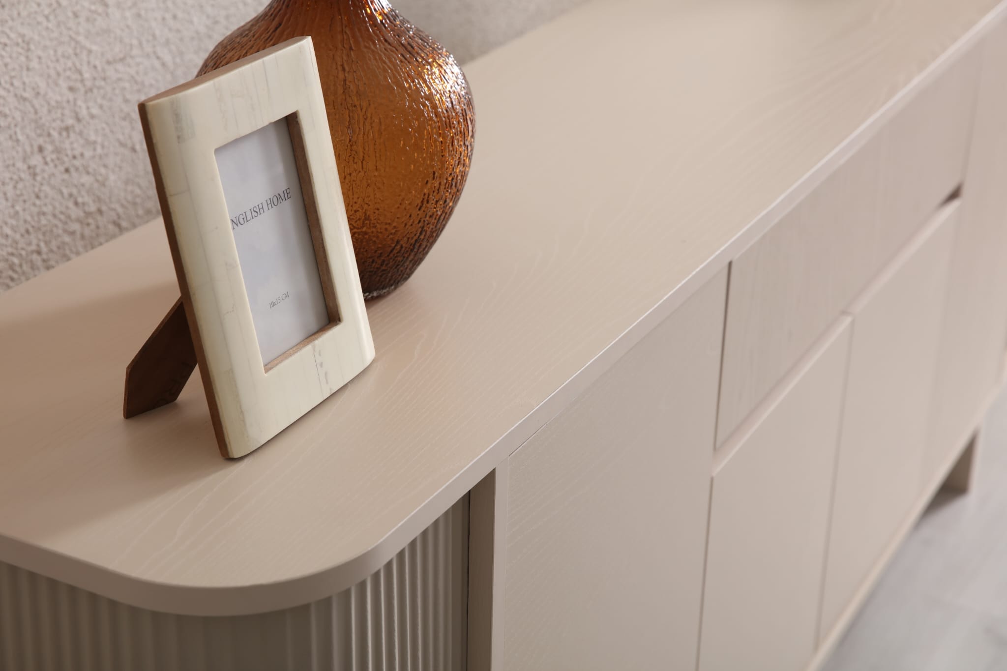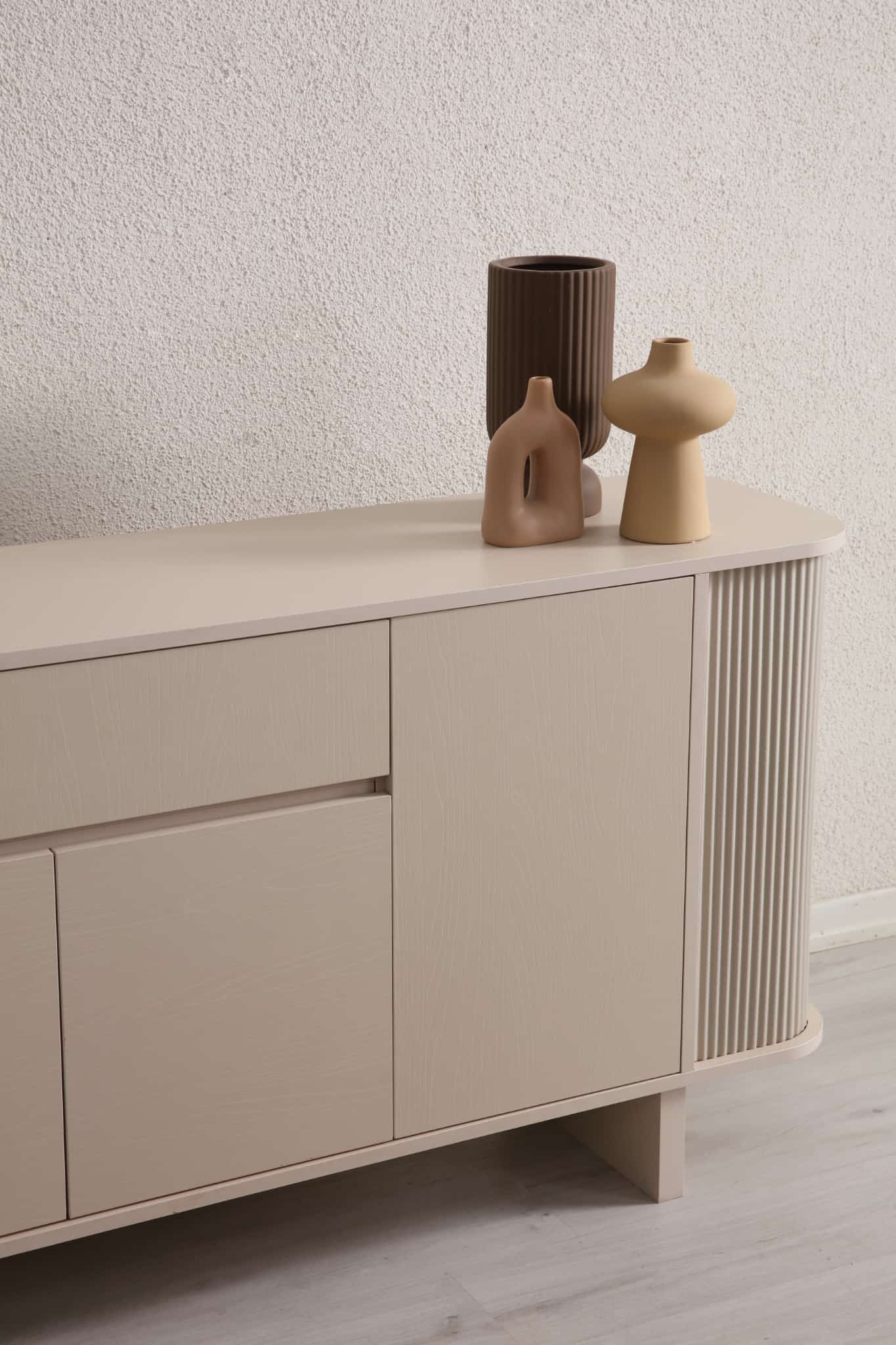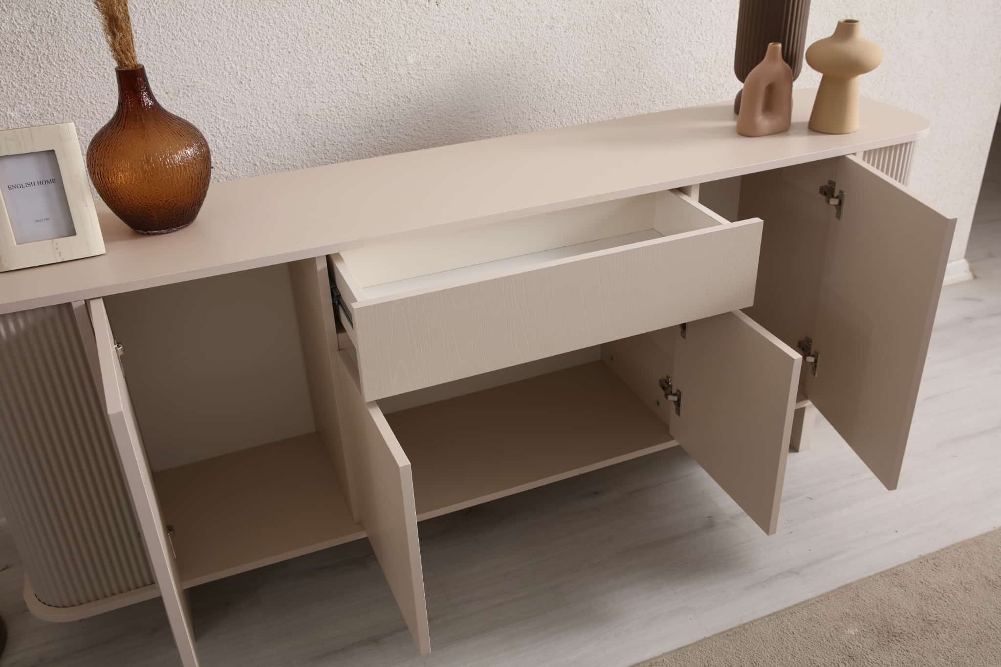 Açılır masa özelliğiyle kalabalık misafir sofralarına kolayca uyum sağlar, kompakt yapısıyla da dar alanlarda bile maksimum kullanım imkanı sunar. Konsolu, geniş iç hacmiyle tüm sofra takımlarınızı düzenli bir şekilde saklamanıza olanak tanır.